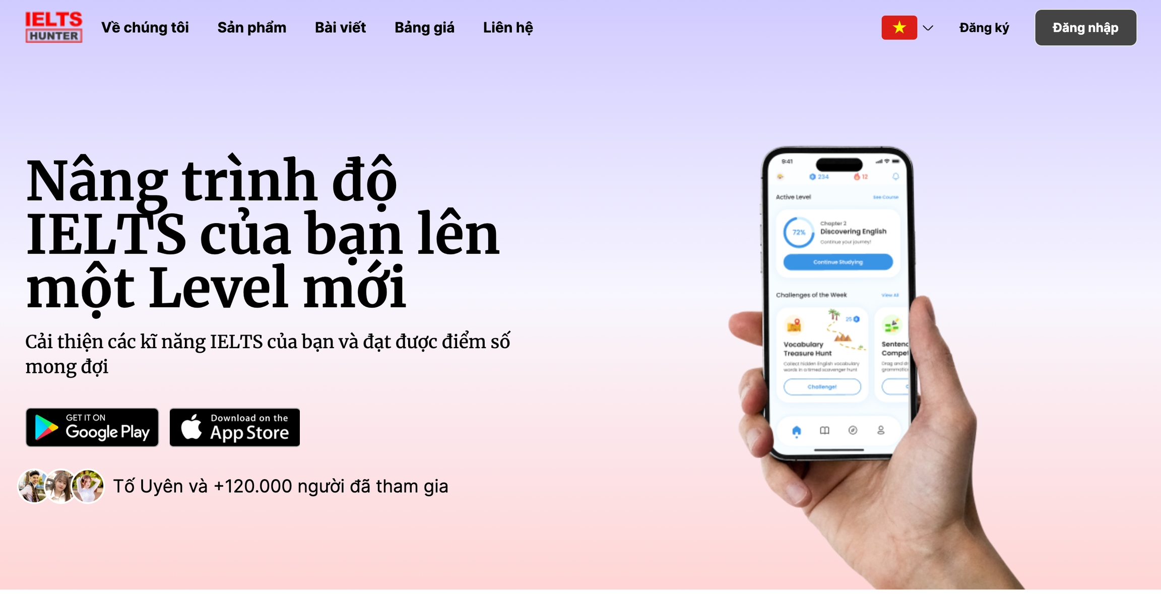 Bước 1: Người dùng truy cập vào website https://ieltshunter.io. Trên giao diện trang chủ, người dùng chọn đăng nhập và sử dụng Google hoặc Facebook để tiến hành đăng nhập vào hệ thống.